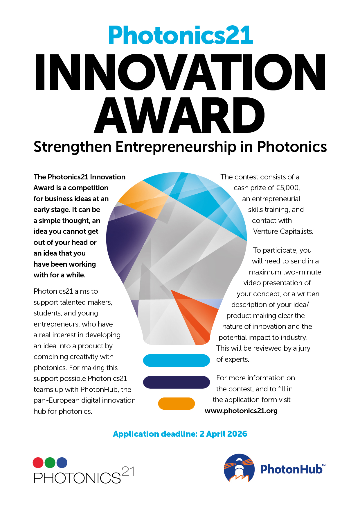 The Photonics21 Innovation Award is a competition for business ideas at an early stage. It can be a simple thought, an idea you cannot get out of your head or an idea that you have been working with for a while.